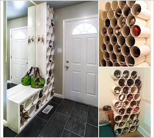 6- خزانة أحذية عصرية، مكونة من مجموعة من الأنابيب الأسطوانية، تعطي مزيداً من أجواء الإثارة لديكور المنزل.