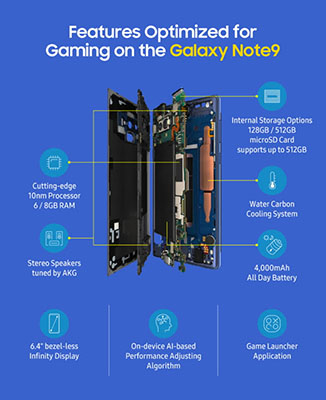 يمكن أن تؤدي ممارسة الألعاب ذات الرسومات المكثفة لفترات طويلة إلى زيادة الضغط على وحدة المعالجة المركزية ووحدة معالجة الرسومات في الهاتف. وبهدف تعزيز كفاءة هاتف Galaxy Note9 للعمل بذات المستوى من الأداء العالي لاسيما عند ممارسة الألعاب، خلصت سامسونج إلى أن نظام التبريد الجديد ينبغي أن يكون أسرع وأكثر كفاءة من الأجيال السابقة.