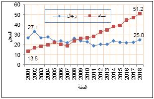 معدل البطالة بين النساء والرجال المشاركين في القوى العاملة (15 سنة فأكثر) في فلسطين، 2001- 2018
