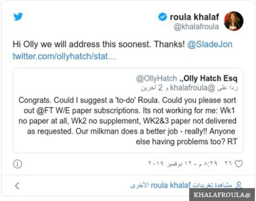 أُعلن الأسبوع الماضي عن تعيين اللبنانية رولا خلف لرئاسة تحرير صحيفة فاينانشال تايمز المتخصصة بالشؤون المالية والاقتصادية، خلفا لرئيس التحرير السابق لايونيل باربر.