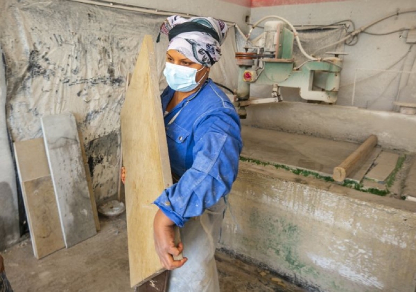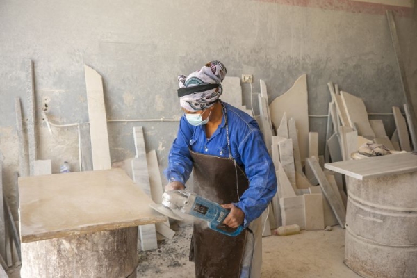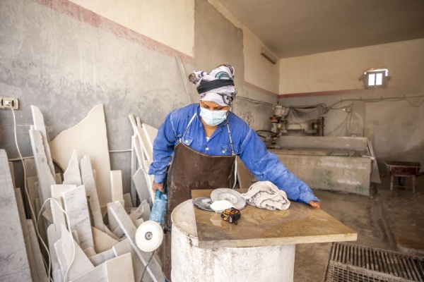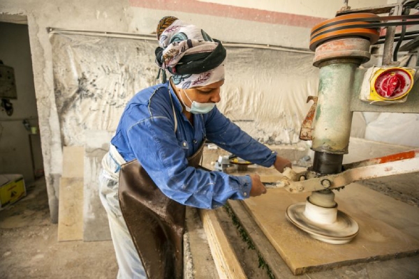 ما إن تقترب منها حتى تتجلى ملامح امرأة جادة صارمة لأن لها الرخام، فقطعته أشكالا مختلفة لكساء مطابخ وسلالم وأرضيات المنازل والساحات.