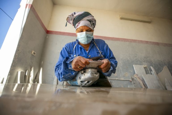 "مجلة جنى" تختفي ملامح فوزية الدغاري أسفل طبقة من غبار الرخام تنبعث من تحت نار آلة قطع وصقل لهذه المادة الصلبة، في ورشتها بأحد أحياء مدينة مدنين، جنوب شرقي تونس.